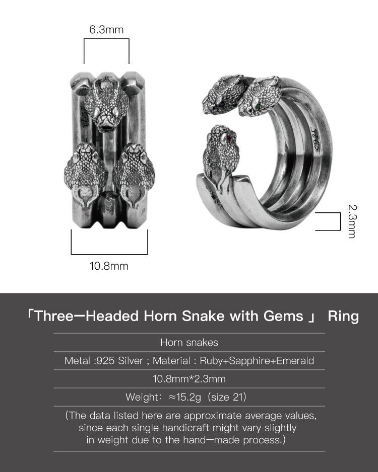 Three–Headed Horn Snake with Gems Ring in 925 Silver